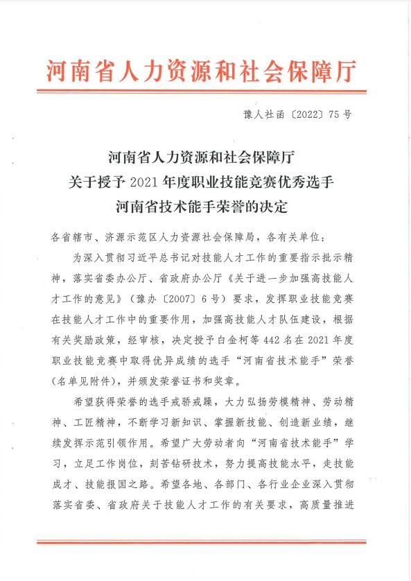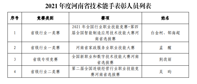 近日,河南省人力资源和社会保障厅发布《关于授予2021年度职业技能竞赛优秀选手河南省技术能手荣誉的决定》(豫人社函〔2022〕75号),我校白金柯、郜海超、孟醒、荆改丽和吴昀5名教师被河南省人力资源和社会保障厅授予“河南省技术能手”荣誉称号。