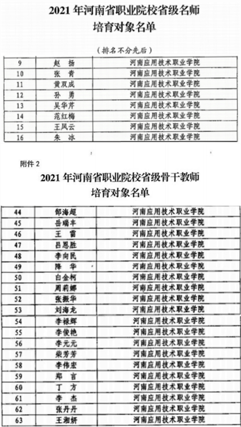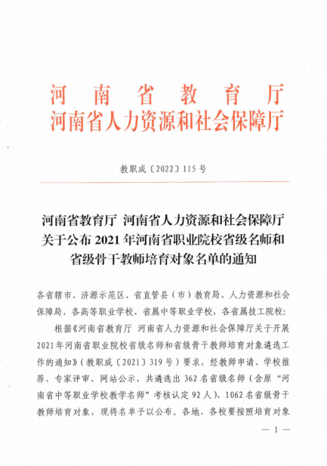 近日,河南省教育厅河南省人力资源和社会保障厅印发了《关于2021年河南省职业院校省级名师和省级骨干教师培育对象名单的通知》(教职成〔2022〕115号)文件,我校赵扬、张青、朱冰、范红梅等8名教师被评为2021年河南省职业院校省级名师培育对象,郜海超、王雷、李向民、丁方等20名教师被评为2021年河南省职业院校省级骨干教师培育对象。