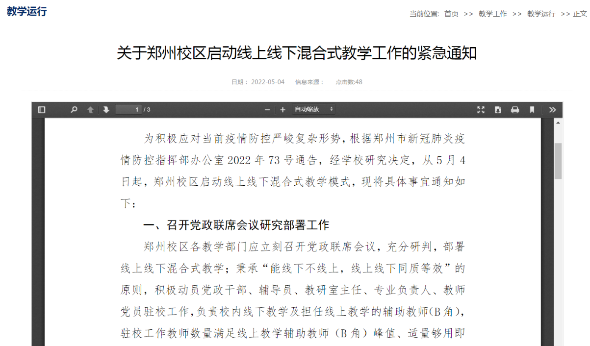 5月3日,郑州市新冠肺炎疫情防控指挥部办公室发布了73号通告,要求主城区各党政机关、事业单位、企业工作人员居家办公。学校党政领导班子立刻召开疫情防控工作紧急会议,分析研判当前郑州疫情防控形势,对后续全校疫情防控工作进行再安排、再部署、再落实。为贯彻学校紧急会议精神,教务处和各教学部门按照“静态管理”的原则调整教学运行,紧急出台了《关于郑州校区启动线上线下混合式教学工作的紧急通知》,积极动员各教学部门领导干部、辅导员、教研室主任、专业负责人、党员教师驻校工作,负责校内线下教学以及作为线上教学的辅助教师。