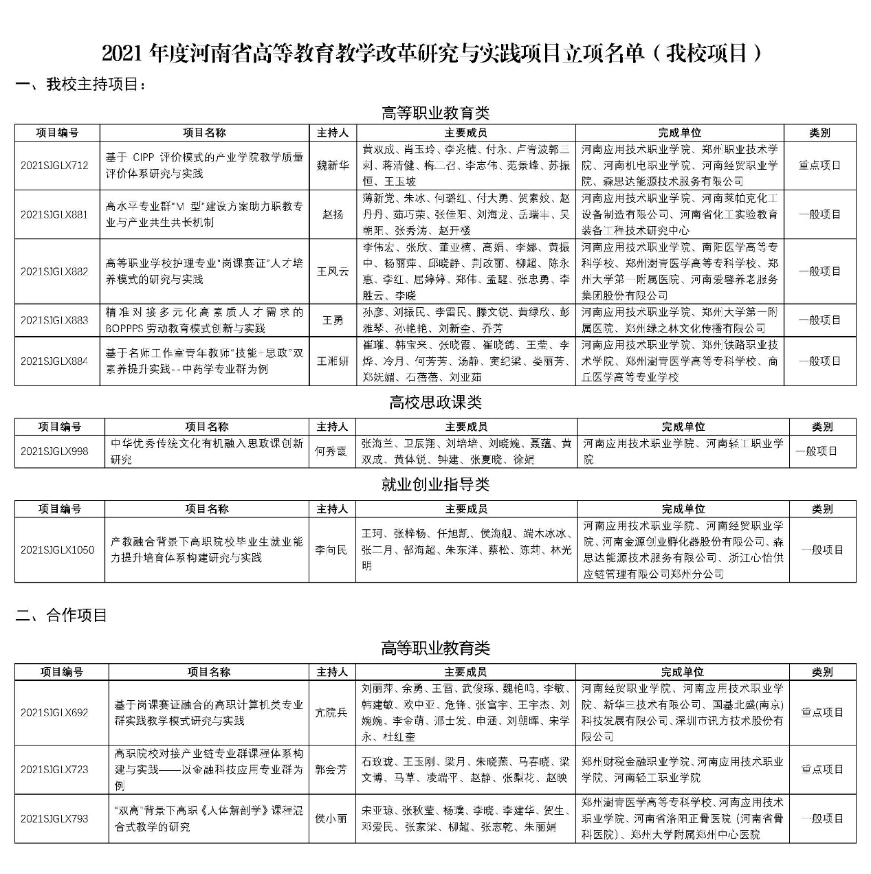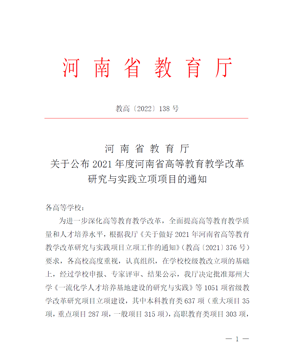 近日,河南省教育厅发布了《河南省教育厅关于公布2021年度河南省高等教育教学改革研究与实践立项项目的通知》(教高〔2022〕138号)文件,我校“基于CIPP评价模式的产业学院教学质量评价体系研究与实践”等10个项目获得立项,其中,我校主持项目7项,合作项目3项,研究项目立项数量再创新高。