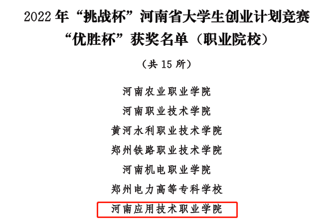 8月30日,由团省委、省教育厅、省人力资源和社会保障厅、省科学技术协会、省学联共同主办的2022年“挑战杯”河南省大学生创业计划竞赛决赛评审结果公布,我校15个参赛项目全部获奖,其中金奖1项、银奖4项、铜奖10项;并从诸多职业院校中脱颖而出,捧得“优胜杯”;侯海舰、张万仑、钟建、臧乐天四位教师获得“优秀指导老师”称号。