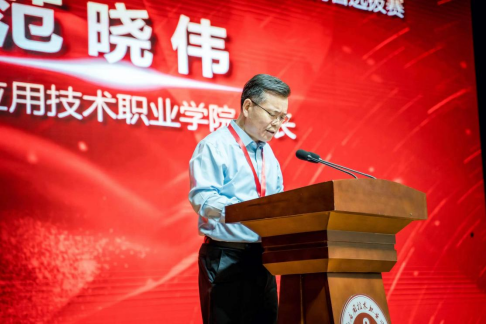 范晓伟发言。他向为大赛付出辛勤劳动的各位评委专家、志愿者及工作人员表示衷心的感谢。他表示,学校将以承办此次大赛为契机,同兄弟院校交流互通,继续强化专业技能训练,打造专业建设品牌,持续深化职业教育改革,再创高质量发展新辉煌!