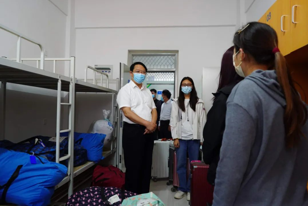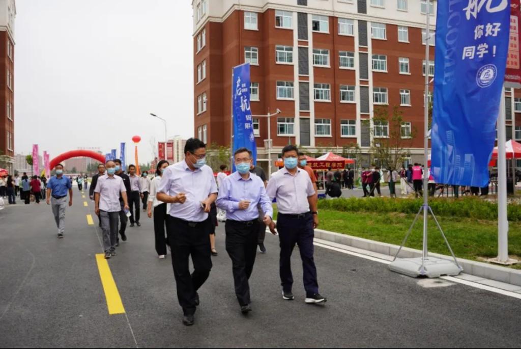 党委书记闫俊山、校长范晓伟一行来到报到现场,走访各个服务站点,详细了解老生搬迁新校区及新生报到情况,看望现场工作人员和志愿者,向他们表达亲切的慰问和由衷的感谢,并要求现场工作人员要本着对师生生命安全高度负责的态度,严格落实返校流程和校园疫情防控总体要求,守好校园安全防线,全力保障新老学生入学工作圆满完成。同时,要以“心”迎新,让新生暖心,让老生安心。随后,他们与学生亲切交流,详细询问学生报到过程中疫情防控情况、来到新校区的感受、入校后的学习规划等,并嘱咐同学们要珍惜在校时光,充分利用新校区资源,努力学习,奋发向上,努力成长为堪当民族复兴重任的时代新人。