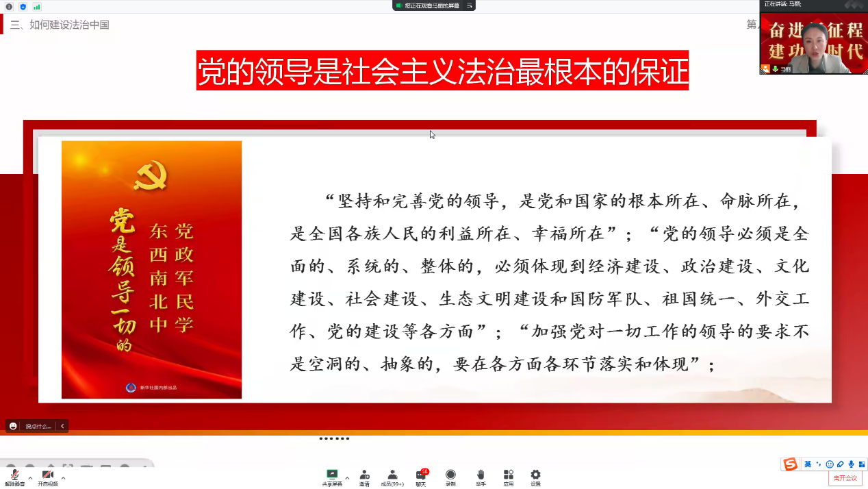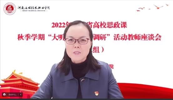 根据河南省委教育工委、河南省教育厅关于思政课秋季学期“大听课”“大调研”活动安排,11月25日,以河南理工大学马克思主义学院院长郑小九为组长,郑州大学马克思主义学院副教授郭文荣、河南职业技术学院马克思主义学院副院长胡海涵、河南理工大学马克思主义学院教师王家涛为成员的第八调研组通过“云端”对我校思想政治理论课建设情况进行调研指导。我校党委委员、副校长陈君丽,党委委员、宣传(统战)部部长黄振中,教务处长赵扬,马克思主义学院院长张振华及部分思政课教师、学生代表参加座谈会。