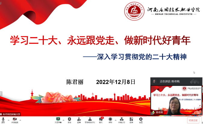 12月8日,校党委委员、副校长陈君丽以《学习二十大永远跟党走 做新时代好青年》为主题,为医药学院和化学工程学院师生带来一堂精彩纷呈的云端专题思政课。