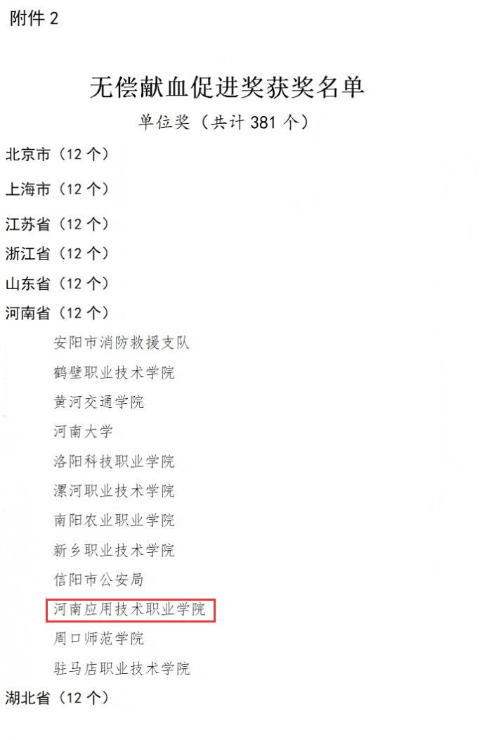 近日,国家卫生健康委、中国红十字会总会、中央军委后勤保障部卫生局下发《关于表彰2020-2021年度全国无偿献血表彰奖励获奖者的决定》,对全国2020-2021年度在无偿献血工作中做出突出成绩的省(市)、单位和个人进行表彰,我校荣获“全国无偿献血促进奖”。