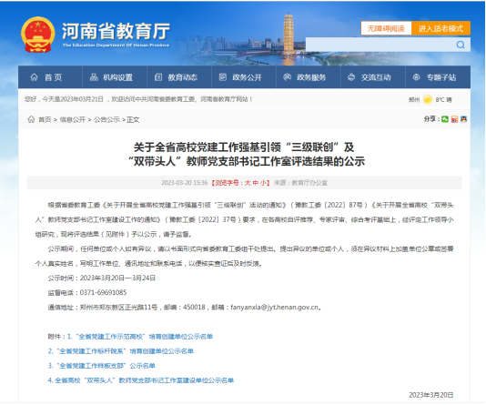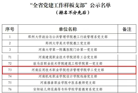3月20日,省教育厅发布了全省高校党建工作强基引领“三级联创”及“双带头人”教师党支部书记工作室评选结果,我校本科部党总支被评选为“全省党建工作标杆院系”培育创建单位、经济管理学院学工党支部被评选为“全省党建工作样板支部”,实现了标杆院系和样板支部两级创优双丰收!