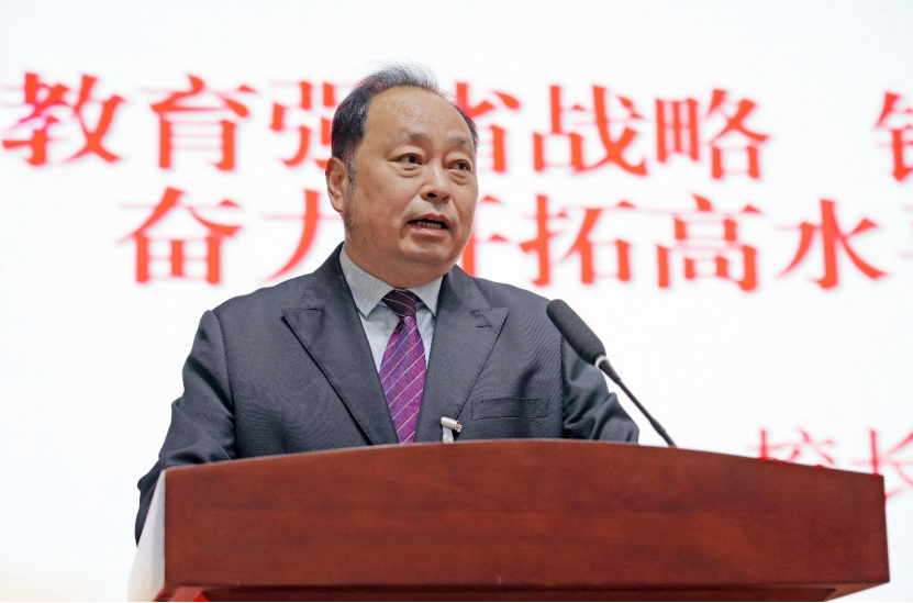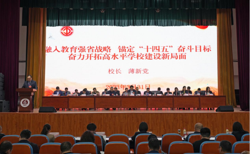 大会在雄壮的国歌声中拉开帷幕。薄新党代表学校向大会作题为《融入教育强省战略锚定“十四五”奋斗目标 奋力开拓高水平学校建设新局面》的工作报告(以下简称《报告》)。《报告》紧紧围绕新时代教育、科技、人才工作的新要求,实事求是、全面系统的回顾了过去一年学校的主要工作,并目标明确,思路清晰的安排部署了2023年重点工作任务,为全校上下进一步凝聚思想共识,实现学校高质量内涵式发展打下了基础、指明了方向。