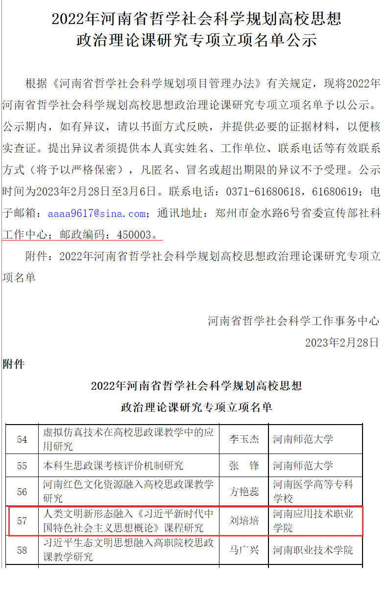 近日,2022年河南省哲学社会科学规划高校思想政治理论课研究专项立项名单公示,我校刘培培老师申报的《人类文明新形态融入<习近平新时代中国特色社会主义思想概论>课程研究》课题获批立项,学校在该项课题申报立项中实现历史性突破。