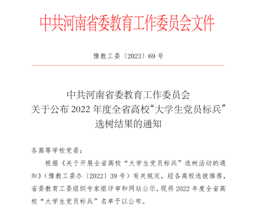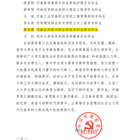 近日,中共河南省委教育工委关于全省高校“大学生党员标兵”评审结果揭晓,经学校遴选、推荐、专家评审、公示,我校本科部学生李书奥以优异的表现脱颖而出,荣膺河南省高校“大学生党员标兵”称号。