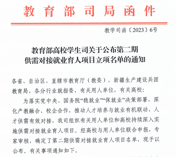 近日,教育部高校学生司发布《关于公布第二期供需对接就业育人项目立项名单的通知》(教学司函〔2023〕6号),经高校申请、用人单位申报、专家审核、立项单位信息核查等流程,我校经济管理学院、商学院申报的就业实习基地项目及信息工程学院申报的人力资源提升项目获批立项。