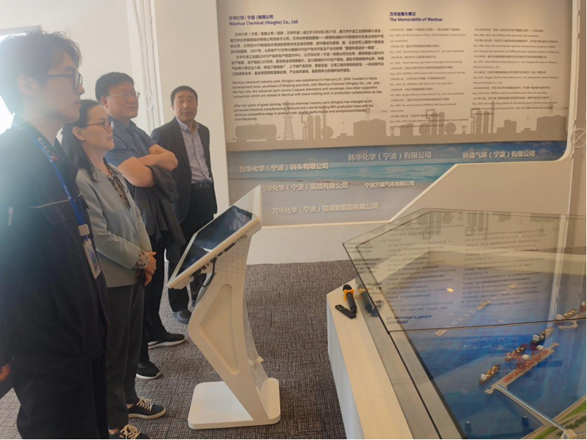 调研期间,万华化学(宁波)股份有限公司人事部经理王山谷带领陈君丽一行参观了企业的生产基地和展厅,详细讲解了企业的发展历程、生产情况、产品的应用和未来的发展方向,并着重阐释了企业在烟台、宁波、四川等六大生产基地及工厂的生产运营网络。