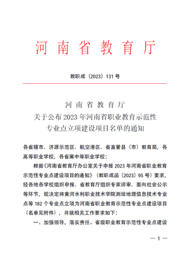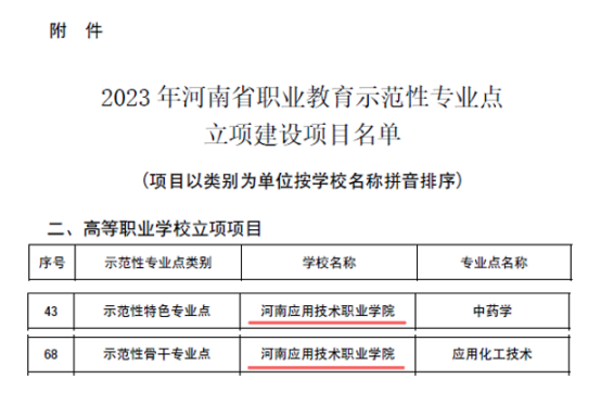 近日,河南省教育厅发布了《关于公布 2023 年河南省职业教育示范性专业点立项建设项目名单的通知》(教职成〔2023〕131 号)文件,我校两专业获批河南省职业教育示范性专业点立项建设项目,其中“应用化工技术”专业为示范性骨干专业点,“中药学”专业为示范性特色专业点。