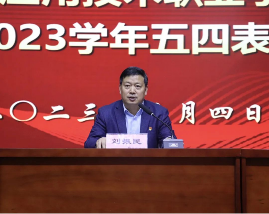 副校长刘振民代表学校向全校广大青年师生致以节日问候和美好的祝愿,向受到表彰的先进集体和个人表示热烈的祝贺!他充分肯定了过去一年全校各级团组织和全体青年团员在共青团工作中取得的优异成绩,并向全体青年学生提出三点希望:一是坚定理想信念,把握青春航向。二是不断加强学习,提升自身素养。三是树立正确价值观,塑造健康人格。他号召大家要坚持高举起“五四运动”不灭的精神火炬,始终把爱国主义作为高扬的光辉旗帜,把勤奋学习作为人生进步的重要阶梯,把深入实践作为成长成才的必由之路,把奉献社会作为不懈追求的优良品德,在学校的建设和发展中创造出更加骄人的青春业绩!