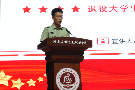 应征报名青年代表邱丙灿和退役入学学生刘磊先后上台发言。他们代表学校学子向大家表达了应征青年立志从军报国的壮志豪情和对军旅生活的向往,以及在退役复学后继续完成学业,报效国家、回报社会的坚定信念。