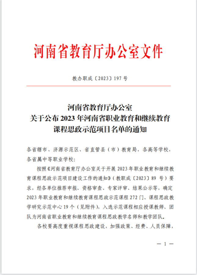近日,河南省教育厅发布了《关于公布2023 年河南省职业教育和继续教育课程思政示范项目名单的通知》(教办职成〔2023〕197号)文件,我校获批6项,其中职业教育课程思政示范项目4项,继续教育课程思政示范项目1项,职业教育课程思政教学研究中心1项。