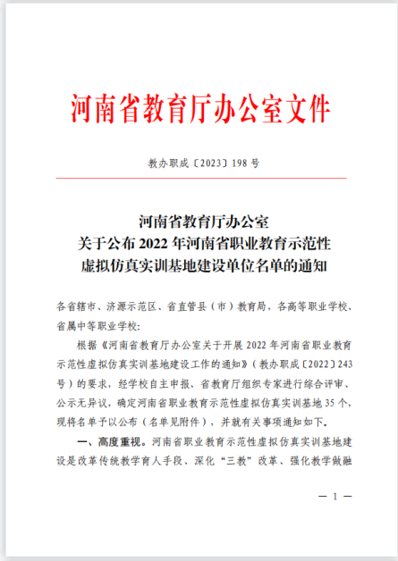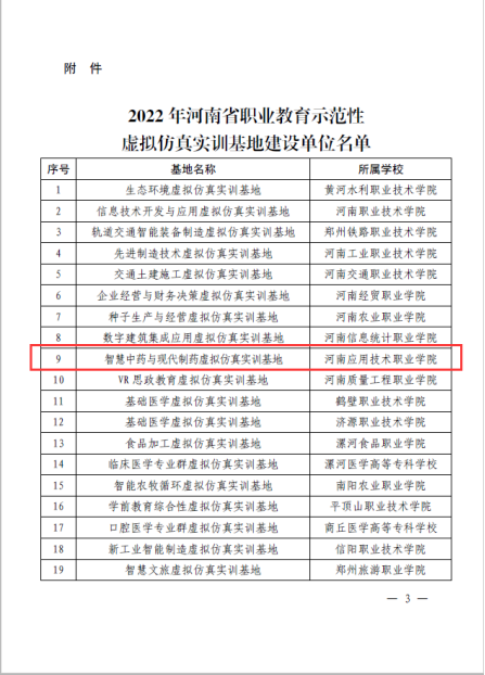 近日,河南省教育厅发布了《关于公布2022 年河南省职业教育示范性虚拟仿真实训基地建设单位名单的通知》(教办职成〔2023〕198号)文件,经学校自主申报、省教育厅组织专家进行综合评审、公示无异议,我校申报的“智慧中药与现代制药虚拟仿真实训基地”项目成功入选。