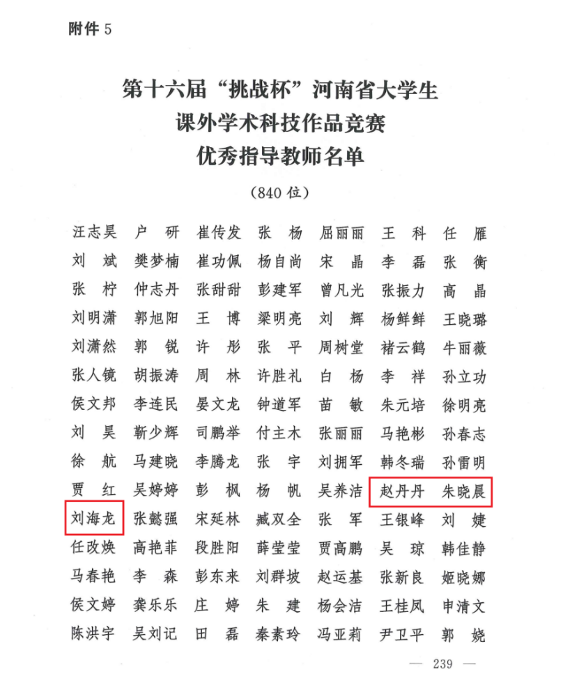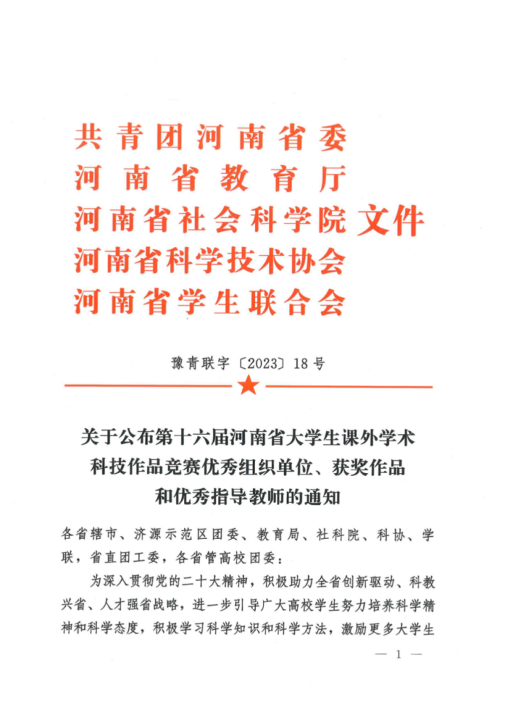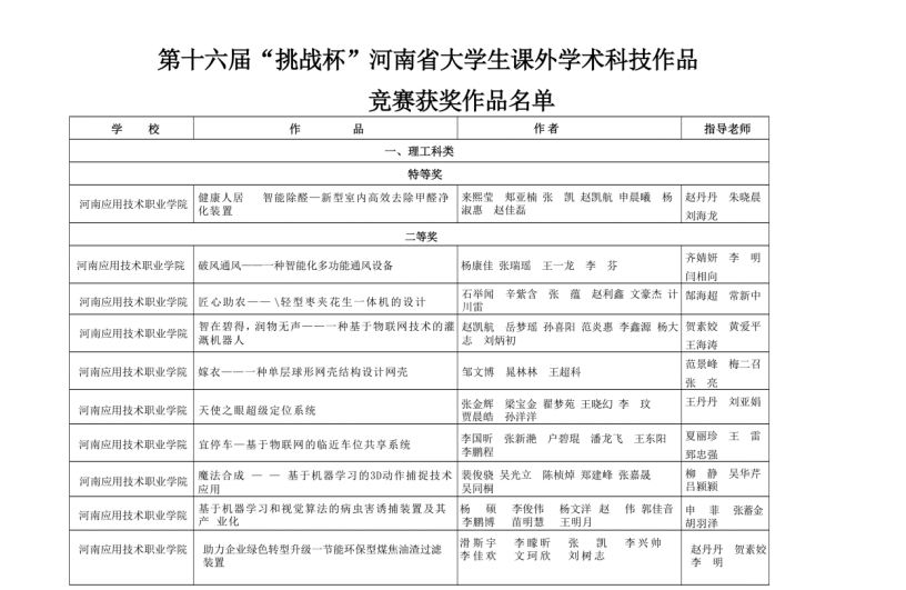 近日,由共青团河南省委、省教育厅、省社会科学院、省科学技术协会、省学生联合会联合举办的第十六届“挑战杯”河南省大学生课外学术科技作品竞赛落下帷幕,我校荣获特等奖1项,二等奖10项,三等奖20项。赵丹丹、朱晓晨、刘海龙三位教师荣获“优秀指导教师”。
