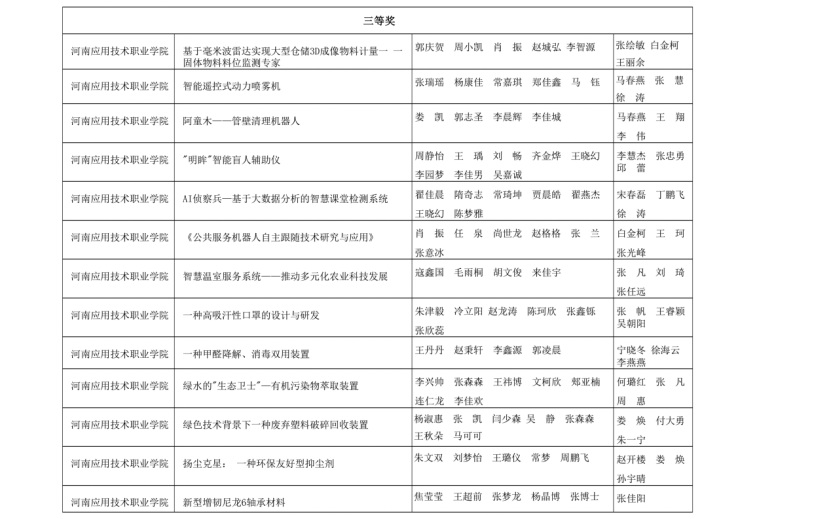 本届赛事自3月份启动以来,校领导亲自部署大赛工作,校团委广泛发动、精心组织、认真筹备,各相关部门密切配合、协同推进,赛事得到全校师生的广泛关注和积极参与。经过院级初赛选拔和校级复赛评审,我校组委会共推选31项作品参加本届赛事,最终《健康人居智能除醛―新型室内高效去除甲醛净化装置》项目获特等奖,并将代表河南省参加全国大赛,其他项目也均在省赛中取得优异成绩。