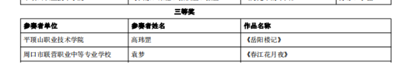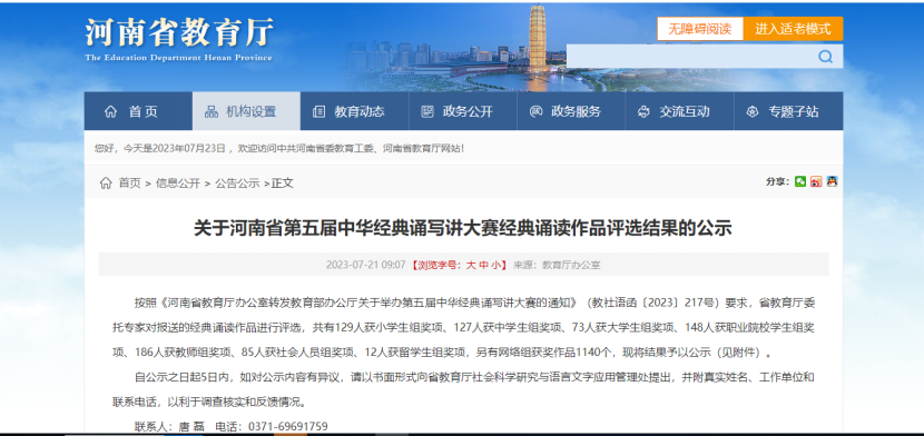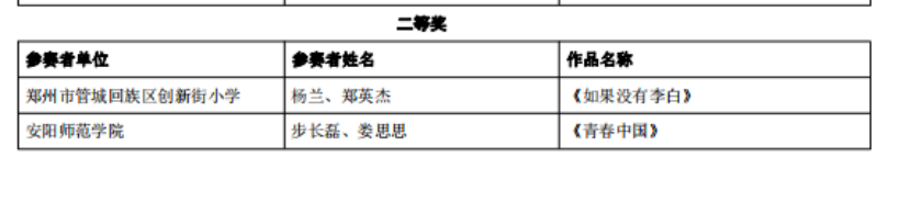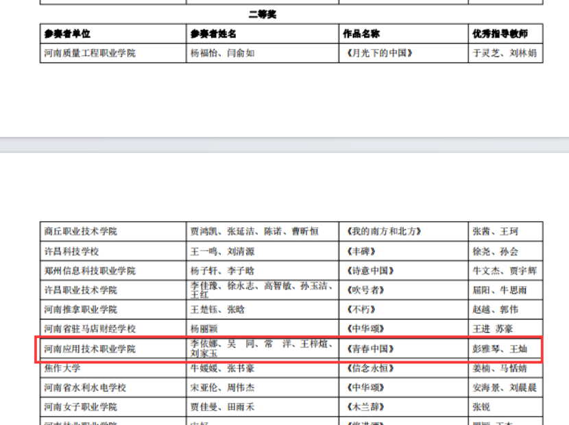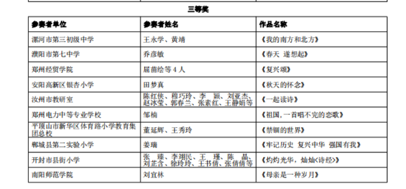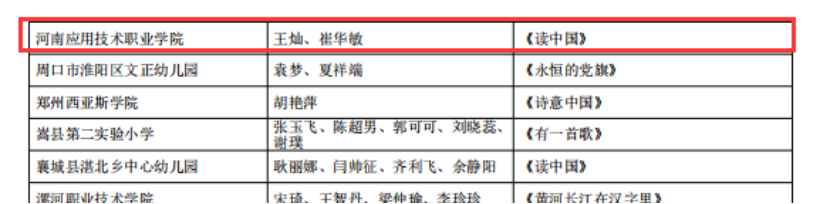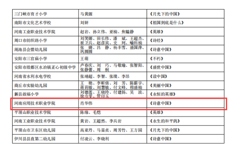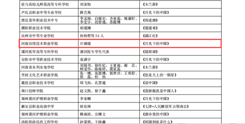 近日,由河南省教育厅主办的第五届中华经典诵写讲大赛经典诵读作品评选结果揭晓,我校申报的四个参赛作品全部获奖。教师肖华伟的《诗意中国》获教师组二等奖,教师王灿、崔华敏的《读中国》获教师组三等奖,学生刘佳玉、李依娜、吴同、常阳等的《青春中国》获得学生组二等奖,学生许璐瑶的《月光下的中国》获得学生组三等奖。