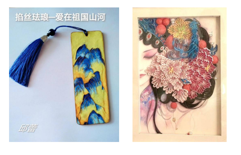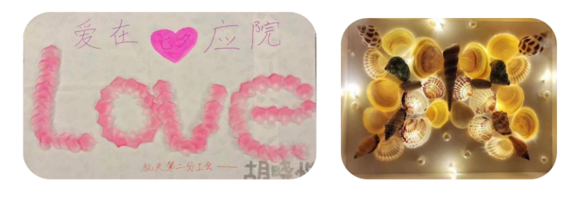 参赛作品主题鲜明,内容健康向上,构思巧妙,富有创造性。刺绣作品“鹊桥会”、剪纸作品“喜鹊剪爱”展示了浪漫七夕鹊桥相会,演绎了两情相悦的浪漫;鲜花瓣组合作品“Love(爱在应院)”,与家庭成员合作,富有童趣,营造了温馨和谐的家庭氛围;贝壳贴画作品“蝶恋物语”用蝴蝶的翩翩起舞传递了爱情的美丽,极富想象力;掐丝珐琅作品“爱在祖国山河”,体现了人与自然的和谐之美,具有时代感、创新性;衍纸画作品“俏花旦”,用具有艺术性的精美戏服头饰,展现了“京剧国粹”这一中华传统文化。