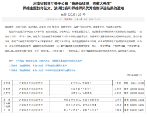 近日,河南省教育厅下发了《关于公布“奋进新征程,志做大先生”师德主题教育征文、演讲比赛和师德师风优秀案例评选结果的通知》(教师〔2023〕291号),我校荣获师德主题教育征文一等奖1名、二等奖2名、三等奖3名的好成绩。
