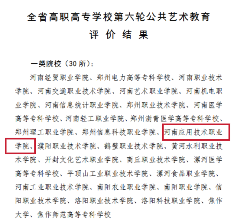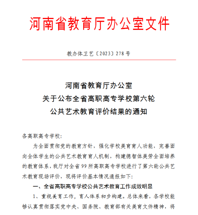 近日,河南省教育厅印发了《关于公布全省高职高专学校第六轮公共艺术教育评价结果的通知》(教办体卫艺〔2023〕278号),我校在本轮公共艺术教育评估中被评为一类院校。
