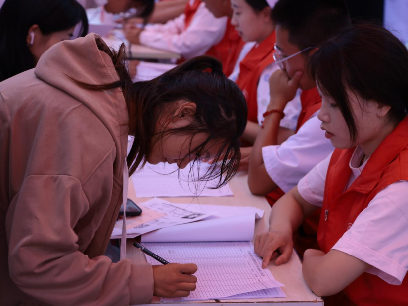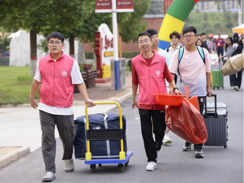 迎新当天,学校门前的智慧大屏实时播放新生报到数据,让广大师生第一时间了解新生报到情况,校园内条幅高悬、气球飞舞、彩旗飘扬,处处洋溢着喜庆欢乐的气氛。学校相关部门、各二级院部通过签名墙、打卡点、展板、文创展示、资助礼包、宣传片展播等形式精心布置迎新现场,为新学期谱写精彩序章;在各站点,师生志愿者为新生搬运行李、热情讲解、耐心引导,帮助新生高效办理报到手续,让新生与学校的初见充满温暖;校内外,爱心服务站、茶水供应处、家长休息处不间断服务,为学生和家长提供便利,让大家真切感受学校的热情周到、体贴入微;学校开通“绿色通道”,安排专人、专项办理家庭贫困学生的入学手续,确保每一个学生不会因家庭经济困难而失学。
