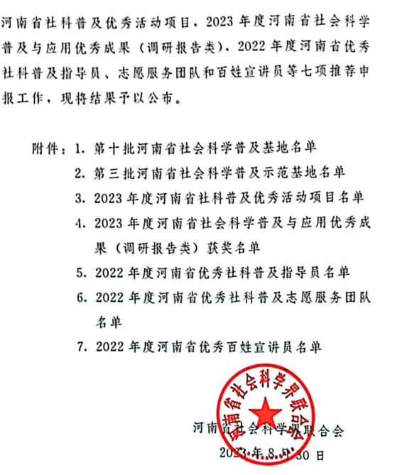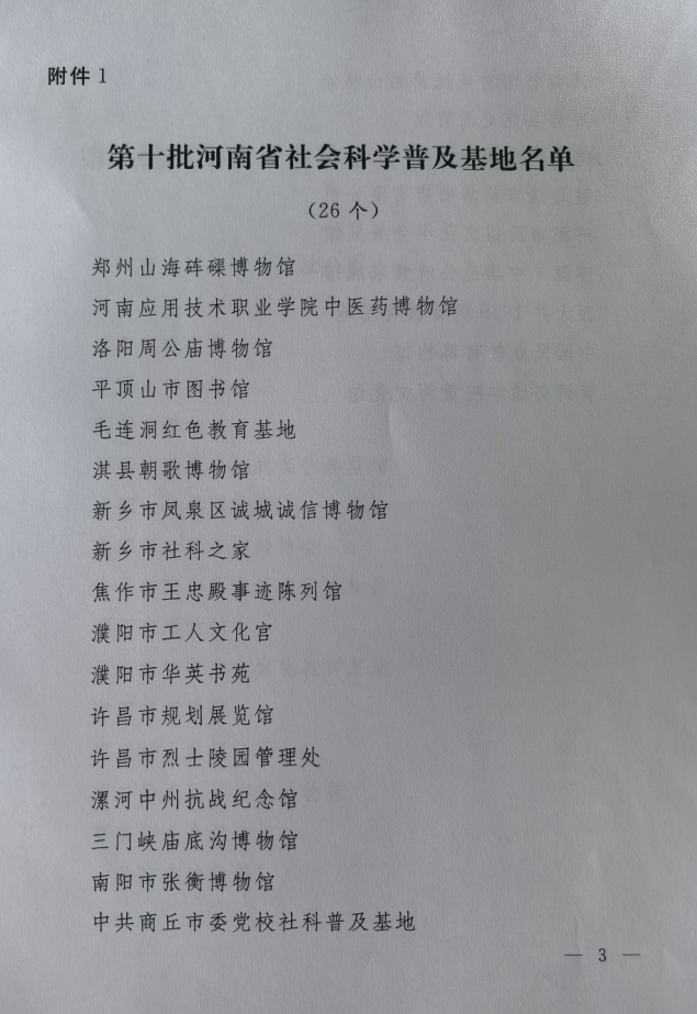 近日,由中共河南省委宣传部、河南省社科联主办的2023年河南省社科普及周活动启动仪式在郑州成功举办。仪式上公布了第十批“河南省社会科学普及基地”,我校中医药博物馆名列其中,这是继2022年获评“首批河南省高中学生实践基地”后再获省级殊荣。