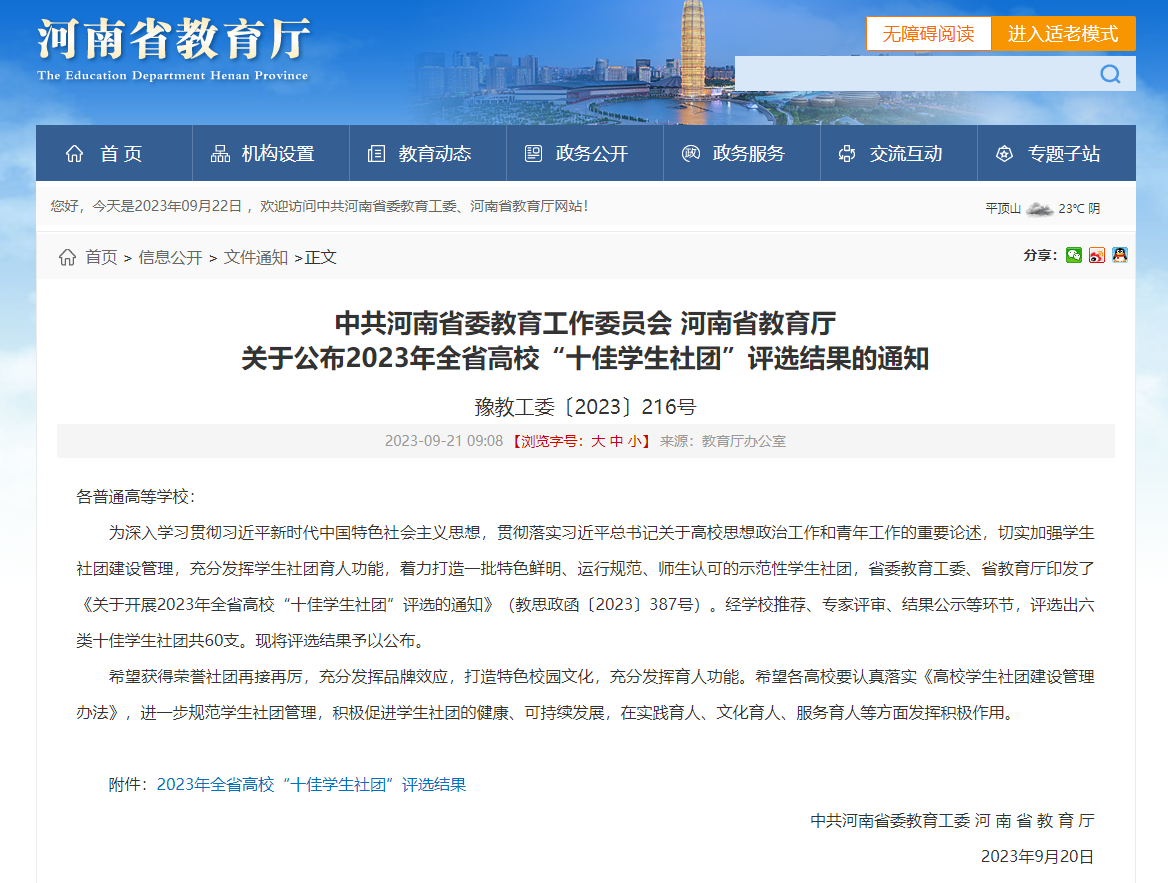 近日,省委教育工委、省教育厅公布2023年全省高校“十佳学生社团”评选结果,经学校推荐、专家评审、结果公示等环节,从123个高校评选出六类十佳学生社团60支,我校OK-English社团脱颖而出,荣获2023年全省高校自律互助类“十佳学生社团”荣誉称号。