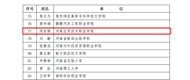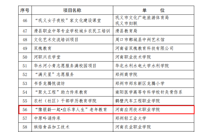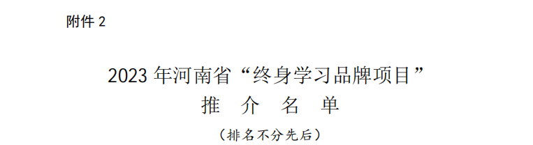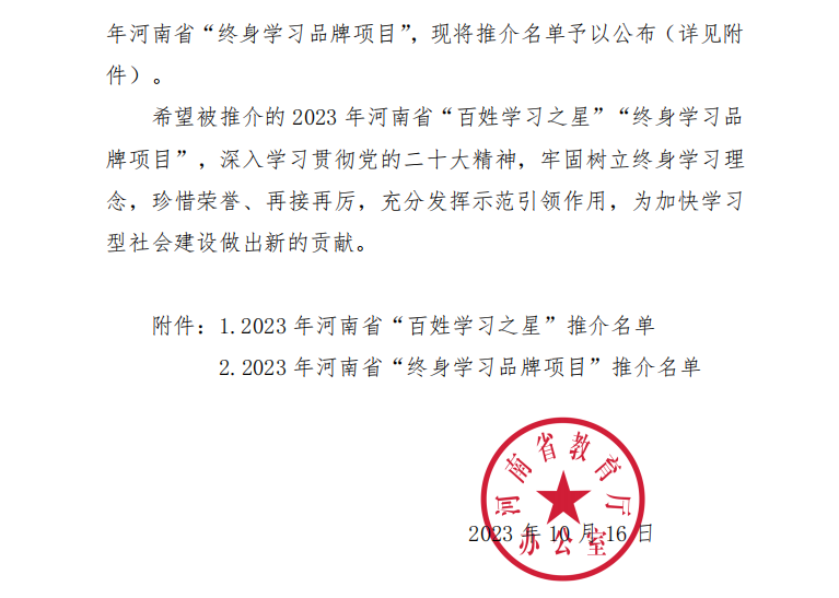 近日,河南省教育厅办公室发布《关于公布2023年河南省“百姓学习之星”“终身学习品牌项目”推介名单的通知》(教办职成〔2023〕369号),我校教师段安琪入选2023年河南省“百姓学习之星”,我校申报的“豫银龄一起•应乐享人生”老年教育入选2023年河南省“终身学习品牌项目”。