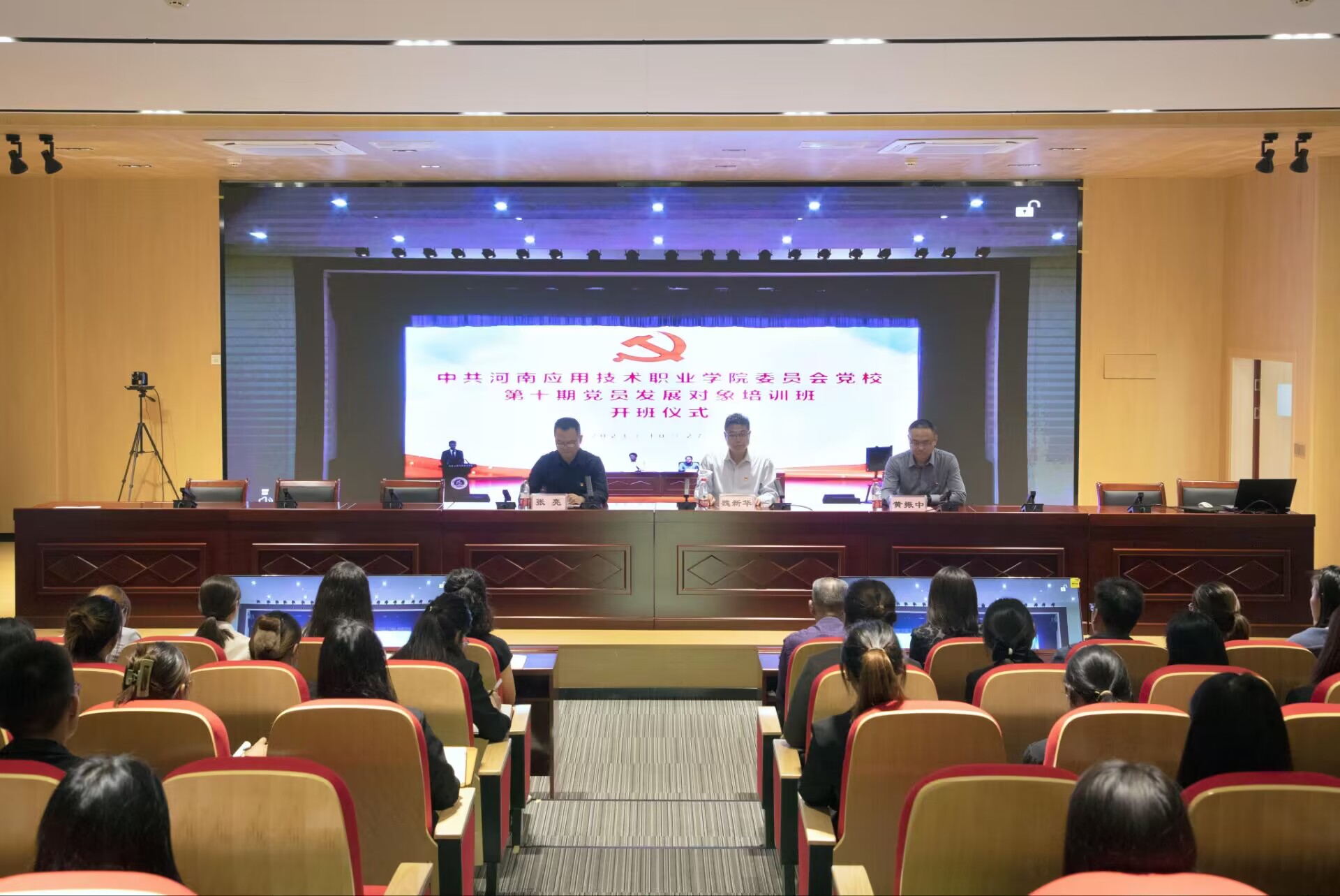 为深入贯彻落实习近平新时代中国特色社会主义思想和党的二十大精神,提升学校党员发展质量,10月27日下午,我校党校第十期党员发展对象培训班开班仪式在郑州、开封两校区同步举行。校党委书记闫俊山,党委委员、副校长魏新华,党委委员、副校长、党校副校长常新中,党委委员、党委宣传(统战)部部长黄振中,党委委员、党委组织部部长滕文锐出席开班仪式。党委办公室、团委等相关部门负责人,各党总支(直属党支部)书记、副书记等党务工作者及全体发展对象参加开班仪式,仪式由常新中主持。