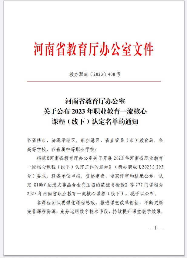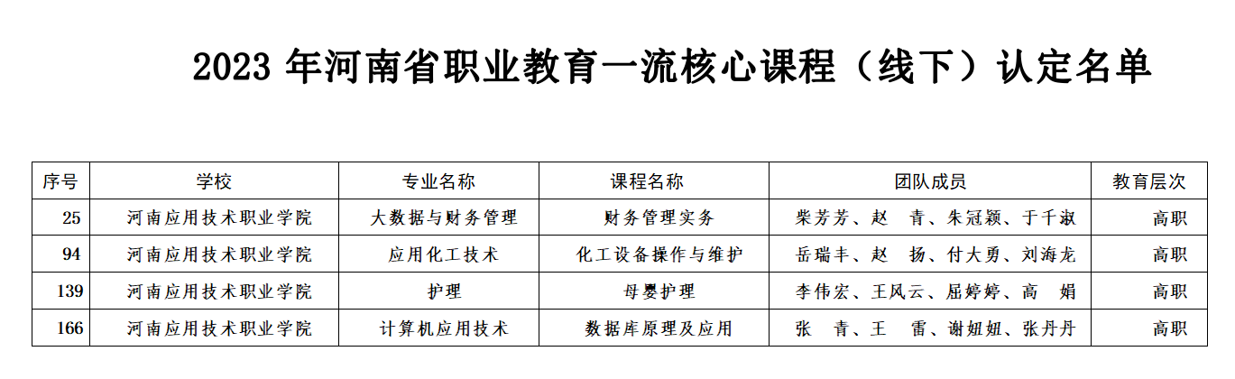 近日,河南省教育厅发布《河南省教育厅办公室关于公布2023年职业教育一流核心课程(线下)认定名单的通知》(教办职成〔2023〕400号)文件,我校《大数据与财务管理》等4门课程入选2023年河南省职业教育一流核心课程(线下)认定名单。