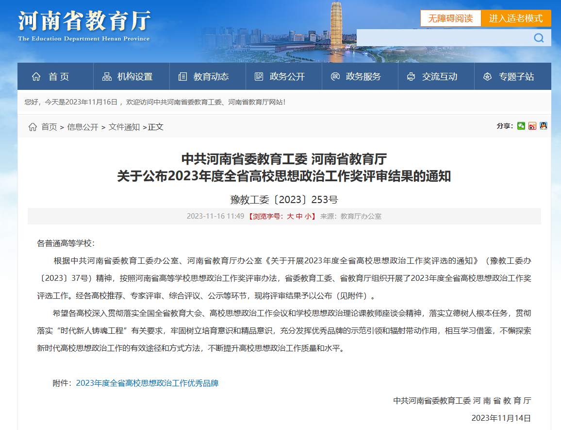 近日,中共河南省委教育工委、河南省教育厅公布了2023年度全省高校思想政治工作优秀品牌评审结果,我校报送的“红色铸魂思想领航工程”荣获2023年度全省高校思想政治工作优秀品牌。