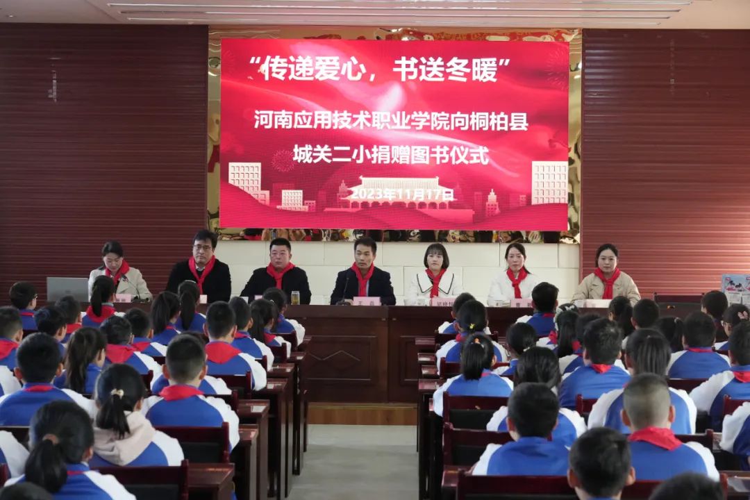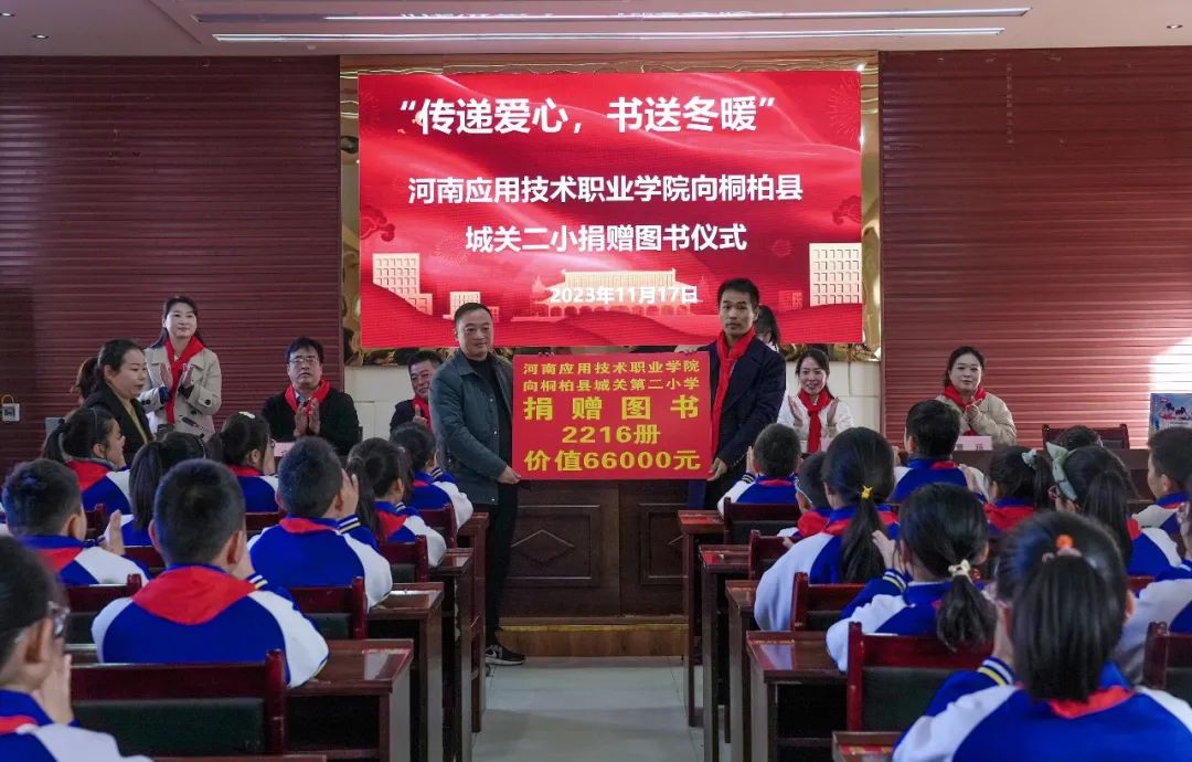 为深入学习贯彻党的二十大精神,推进新时代文明实践志愿服务活动,11月17日上午,我校党员志愿者一行前往桐柏县城关第二小学开展“传递爱心,书送冬暖”图书捐赠活动。校党委宣传(统战)部副部长王磊,桐柏县新时代文明实践中心主任刘家顶,桐柏县教体局党组成员、副局长许建勋,桐柏县城关第二小学校长董国庆等出席捐赠仪式,城关第二小学部分师生代表参加仪式。