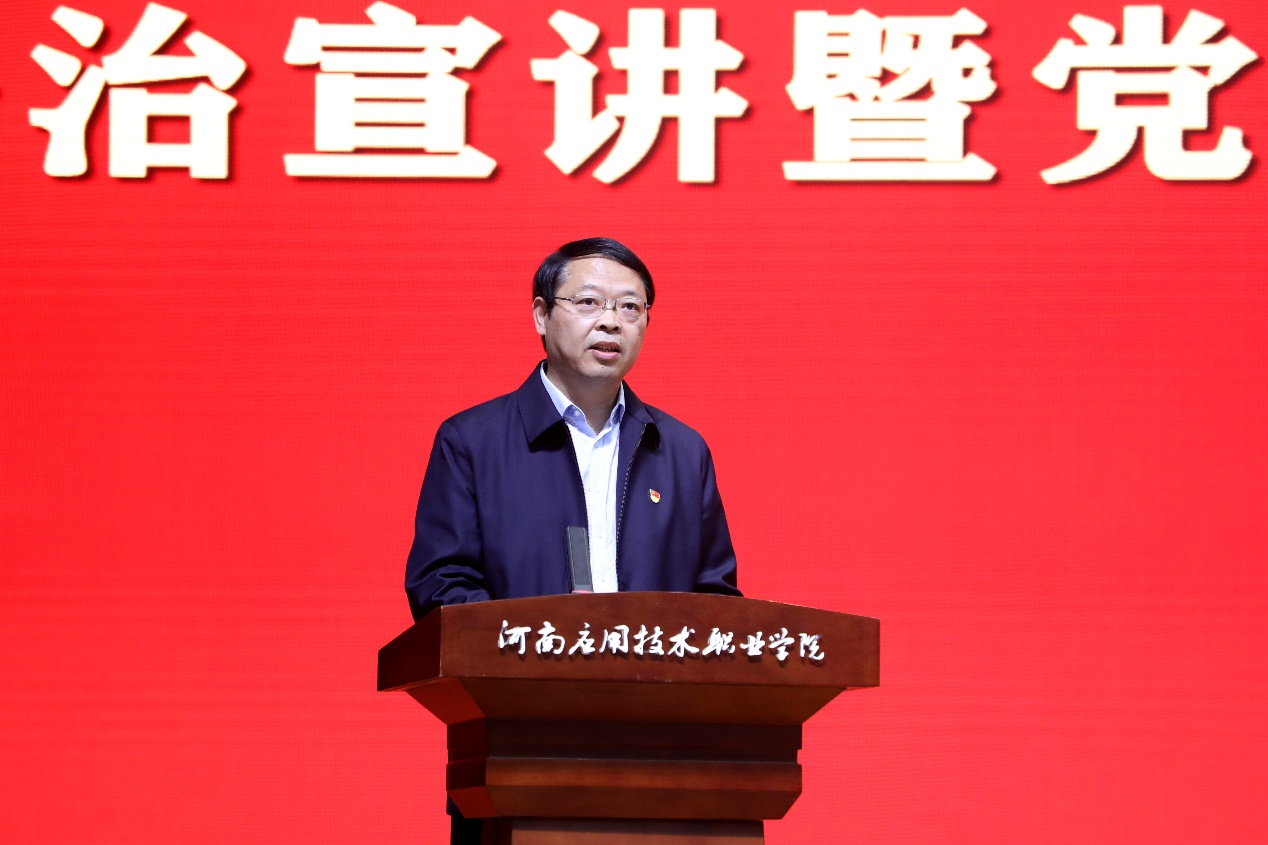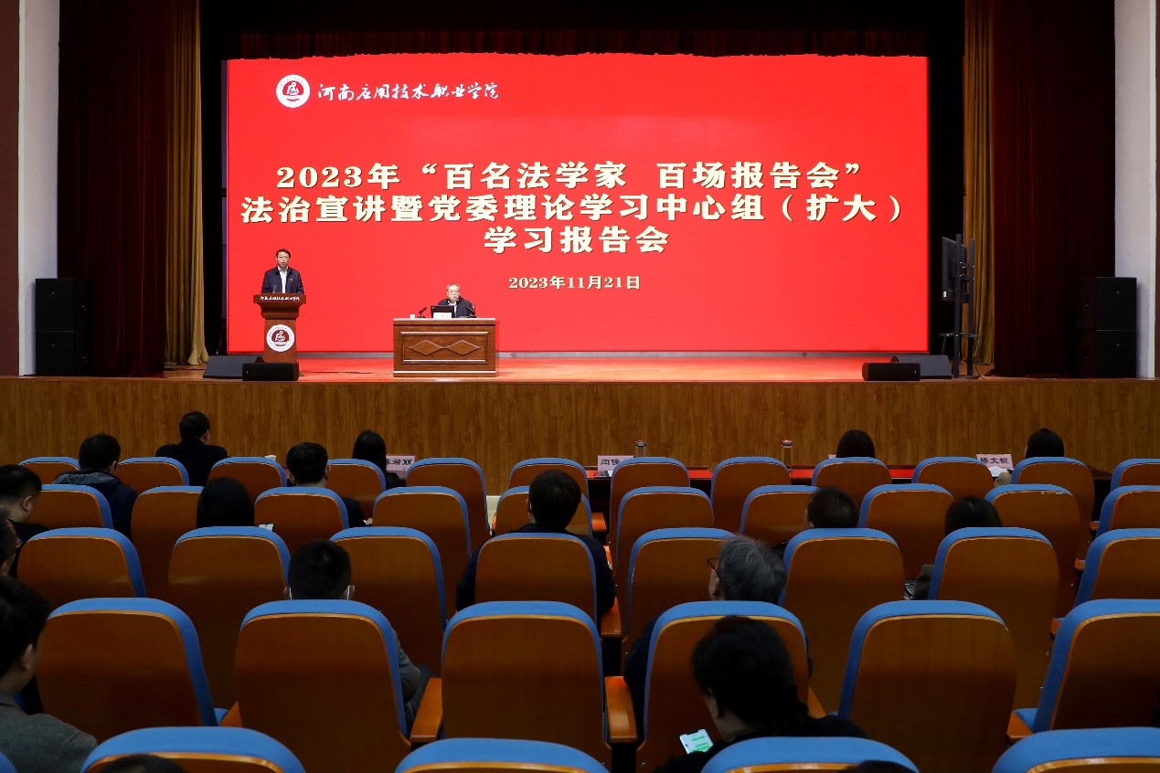 为进一步深入学习贯彻习近平法治思想,做好学校法治宣传教育,深化依法治教、依法治校和依法办学,11月21日下午,我校举行2023年“百名法学家 百场报告会”暨党委理论学习中心组(扩大)学习报告会。郑州大学法学院博士生导师王建国教授受邀作宣讲报告。校党委理论学习中心组成员、全体教职工和部分学生代表参加报告会。会议由党委书记闫俊山主持。