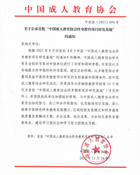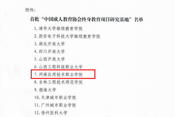近日,中国成人教育协会公布2023年全国首批“终身教育项目研究基地”名单,经过推荐申报、资格审核、专家评审,全国共有23所院校成功入选,河南省仅入选1家,我校榜上有名。