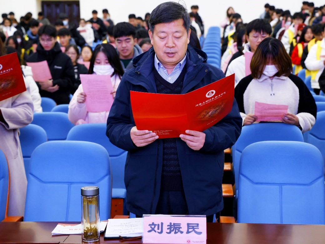 9时30分,在学生活动中心,举行了“宪法宣传周”系列活动启动仪式,副校长刘振民出席仪式,党委学生工作部、团委及各二级学院(本科部)党总支书记、副书记、辅导员代表及学生代表参会。仪式上,全体人员通过教育部全国青少年普法网收看了“宪法晨读”活动网络直播,并同步跟读宪法部分条款。