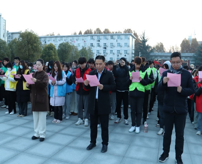 上午7时整,我校举行了国家宪法日升旗仪式。仪式过后,开展了国旗下的“宪法晨读”活动,团委书记李海涛领读,院长办公室(法治办公室)主任黄体锐与同学们一起跟读宪法部分条款。