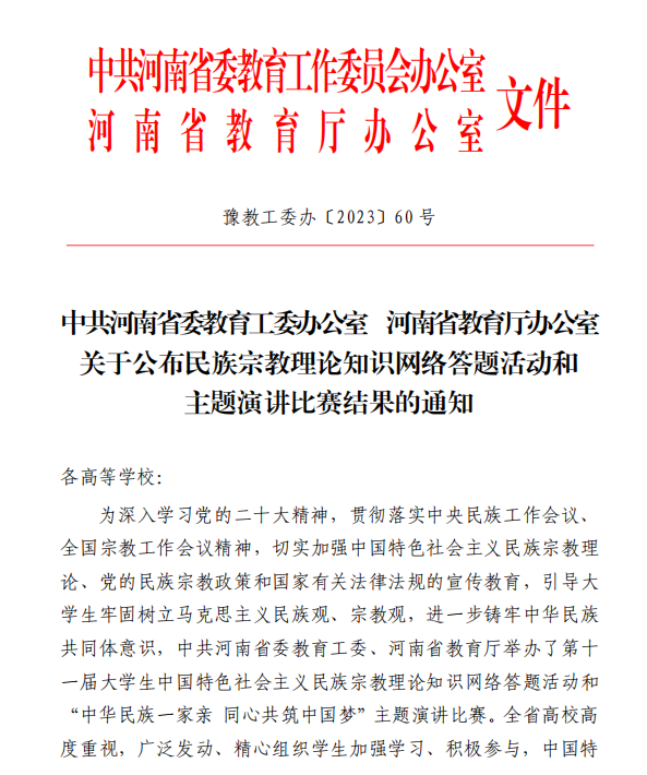 近日,中共河南省委教育工委办公室、河南省教育厅办公室发布《民族宗教理论知识网络答题活动和主题演讲比赛结果的通知》(豫教工委办〔2023〕60号),我校在两项比赛中双双取得优异成绩。