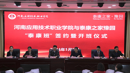 1月9日,我校与泰康之家豫园养老服务有限公司签约仪式暨2024届“泰康班”开班仪式在郑州校区举行。学校副校长常新中,豫园社区总经理张银、人力资源总监王中升出席会议。校企合作与就业处负责同志,护理学院党政负责人及师生代表在场共同见证。会议由护理学院院长王风云主持。
