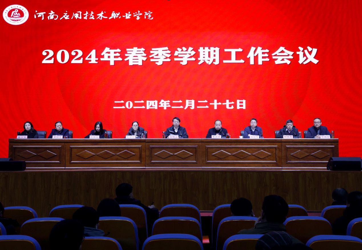 校长薄新党简要回顾了2023年学校工作,通报了2024年寒假工作,安排部署了春季学期整体工作。薄新党指出,2024年是贯彻落实党的二十大精神的关键之年,是全面统筹推进教育强国和教育强省规划纲要的开局之年,也是能否再一次抓紧抓牢历史际遇和战略机遇在应院发展史上留下浓墨重彩一笔的关键之年。春季学期要牢牢把握教育“三个属性”,校准方向,聚焦重点,凝聚力量,再创新佳绩。一是持续强化高质量党建引领作用。深刻认识准确把握教育强省建设“五个维度”的时代内涵、“五个命题”的建设目标、“五个始终”的建设路径,进一步激发基层党组织活力动力,着力构建落实立德树人根本任务新生态新格局。二是深入参与教育强省生动实践。主动对标对表省委教育工委、省教育厅高质量发展行动目标任务,聚焦河南省主导优势产业以及重点培育的28个千亿级产业链,结合学校实际,全力打造职业教育高地。三是纵深推进“双高工程”建设。认真贯彻落实国家和省职业教育政策、战略部署,以产教融合为重点,以科教融汇为新方向,积极打造“五金新基建”,为学校全力冲击国家级“双高”校奠定坚实基础。