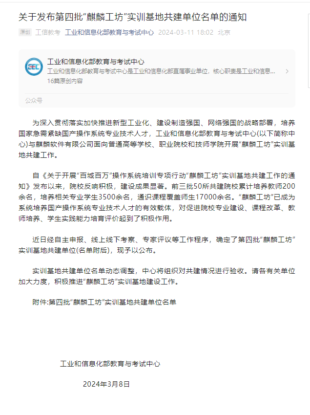 近日,我校成功申报全国第四批“麒麟工坊”实训基地共建单位。