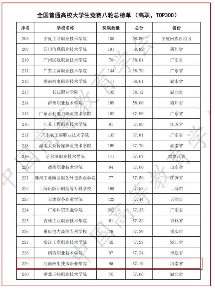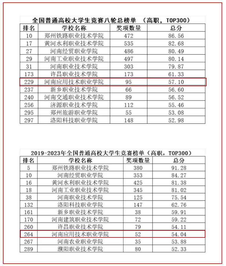 近日,中国高等教育学会发布2023全国普通高校大学生竞赛排行榜。我校以95个奖项数量,在全国普通高校大学生竞赛八轮总榜单(高职)中位列第229位,河南省高职院校第7位,全国排名和省内排名分别提升了2位。在2019—2023年全国普通高校大学生竞赛排行榜(高职)中位列第264位,河南省第10位。