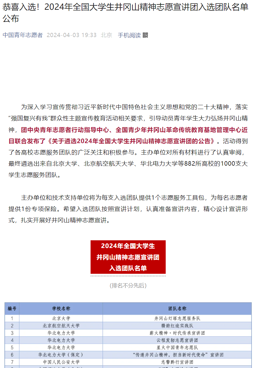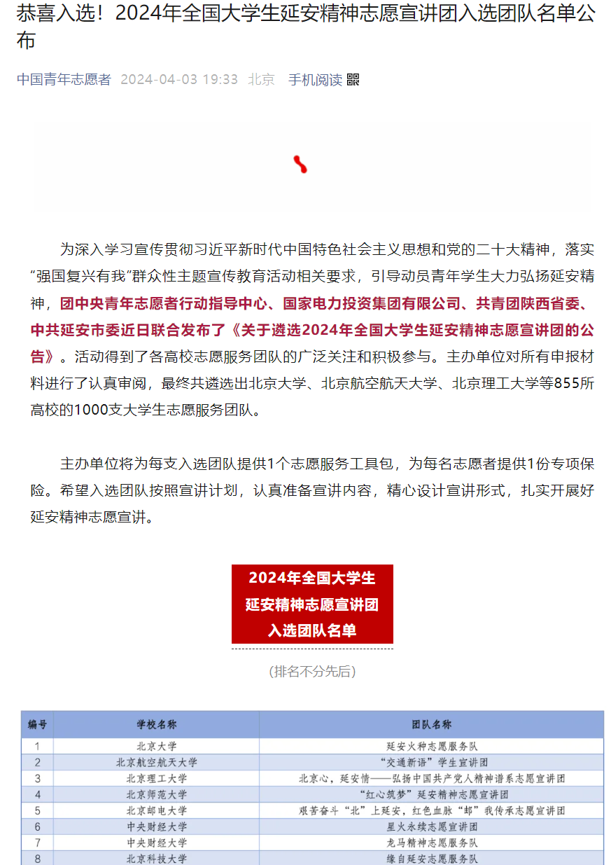 近日,团中央青年志愿者行动指导中心、国家电力投资集团有限公司、共青团陕西省委、中共延安市委、全国青少年井冈山革命传统教育基地管理中心联合发布了《关于遴选2024年全国大学生延安精神志愿宣讲团的公告》《关于遴选2024年全国大学生井冈山精神志愿宣讲团的公告》。主办单位对所有材料进行了认真审阅,最终遴选出来自北京大学、北京航空航天大学、华北电力大学等高校的1000支大学生志愿服务团队。我校“延安故事宣讲队”“井冈山故事宣讲队”成功入选。