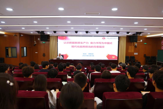6月7日上午,校长薄新党以“认识把握新质生产力,奋力书写为中国式现代化挺膺担当的青春篇章”为题,在郑州校区思政大讲堂为化学工程学院2023级应用化工技术专业学生讲授了一堂生动精彩的思政课。