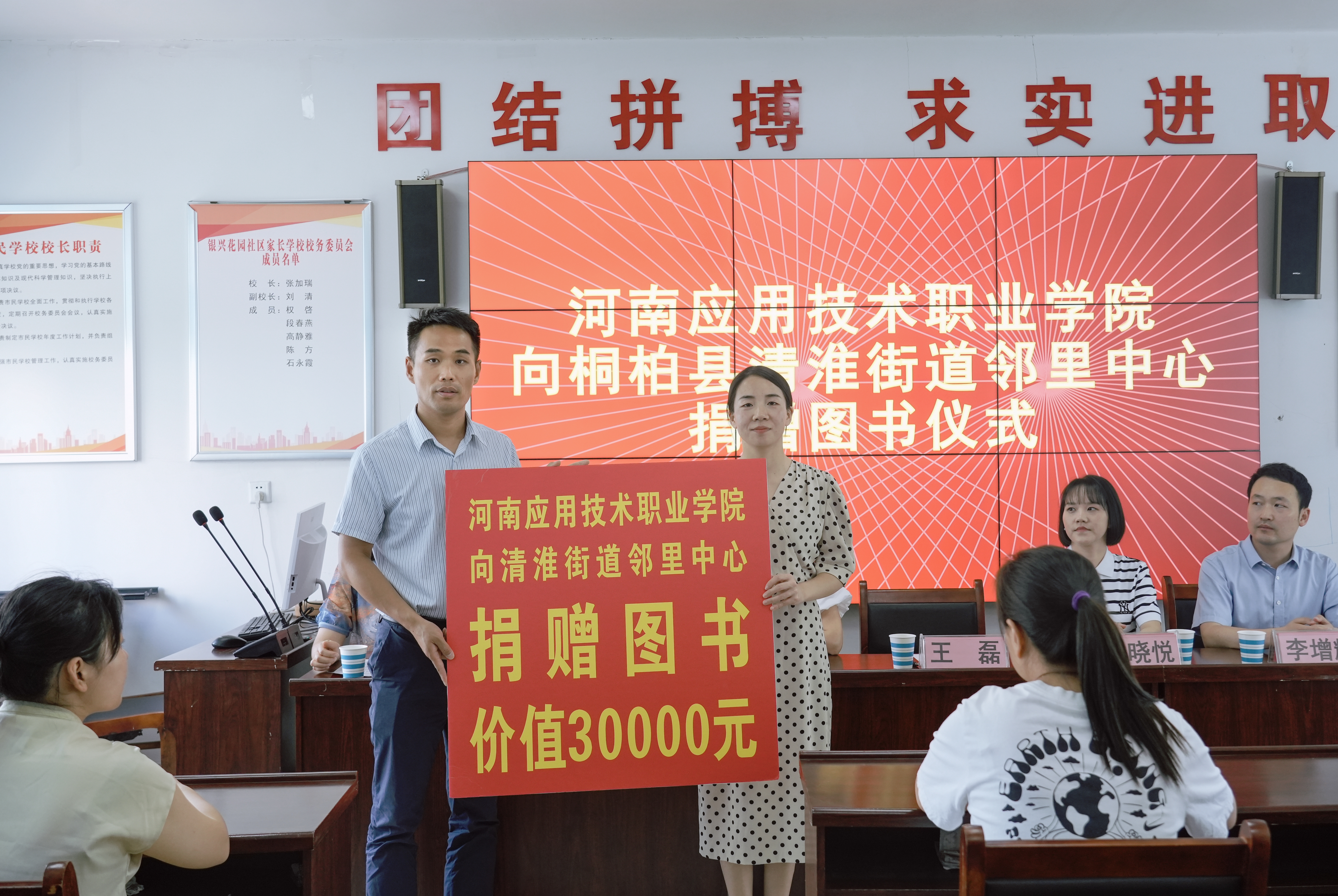 刘佩代表清淮街道发言。她表示,邻里中心将充分利用好这批爱心图书,发挥好图书的引导、教育作用,大力开展读书活动,确保捐赠的图书更好地服务社区居民,使其发挥最大价值。希望清淮街道的居民牢记河南应用技术职业学院的关怀,常读书、多读书,读好书、会读书,让阅读成为一种习惯,提高个人素养,积极回馈社会。