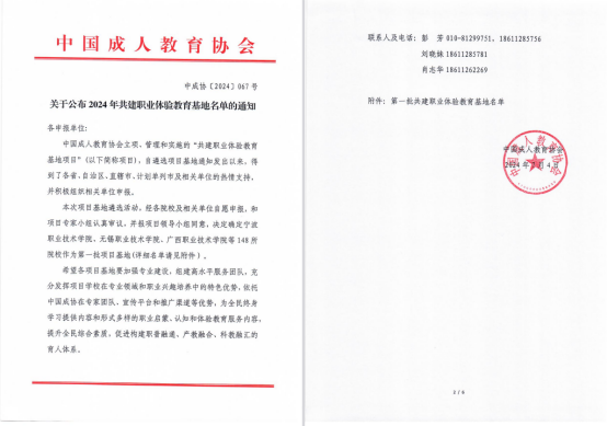 近日,中国成人教育协会发布《关于公布2024年共建职业体验教育基地名单的通知》(中成协〔2024〕067号),全国共148所院校获评2024年首批共建职业体验教育基地,我校名列其中。