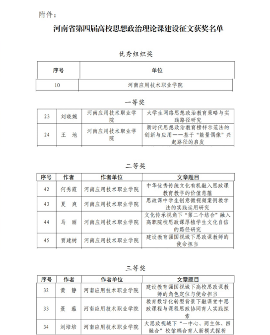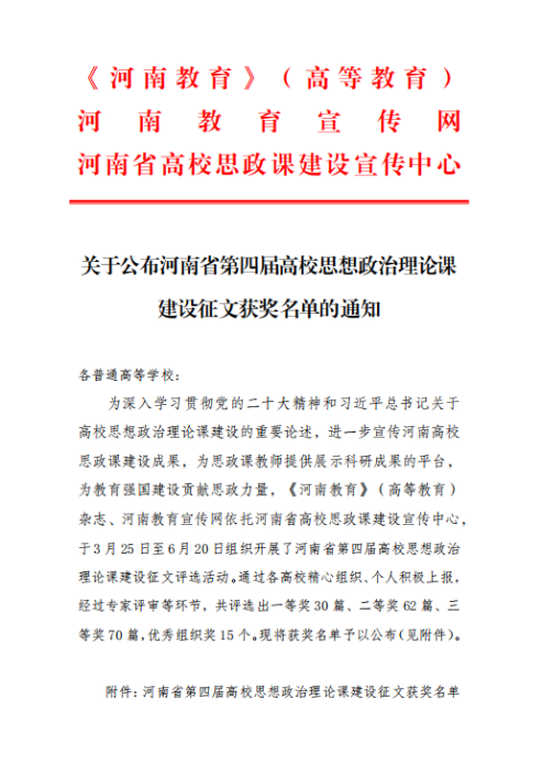 近日,《河南教育》(高等教育)、河南教育宣传网、河南省高校思政课建设宣传中心发布《关于公布河南省第四届高校思想政治理论课建设征文获奖名单的通知》,经过作品上报、专家评审等环节,共评选出一等奖30篇、二等奖62篇、三等奖70篇,优秀组织奖15个。我校参赛作品获一等奖2篇,二等奖4篇,三等奖3篇,学校被评为优秀组织奖。