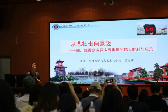 在专题教学环节,四川大学马克思主义学院副教授吕志辉作了题为“从悲壮走向豪迈——四川抗震救灾及灾后重建的伟大胜利与启示”专题报告,让大家重温了“万众一心、众志成城,不畏艰险、百折不挠,以人为本、尊重科学”的伟大抗震救灾精神,深刻感受到了中华民族在发展历程中气势磅礴的精神力量。
